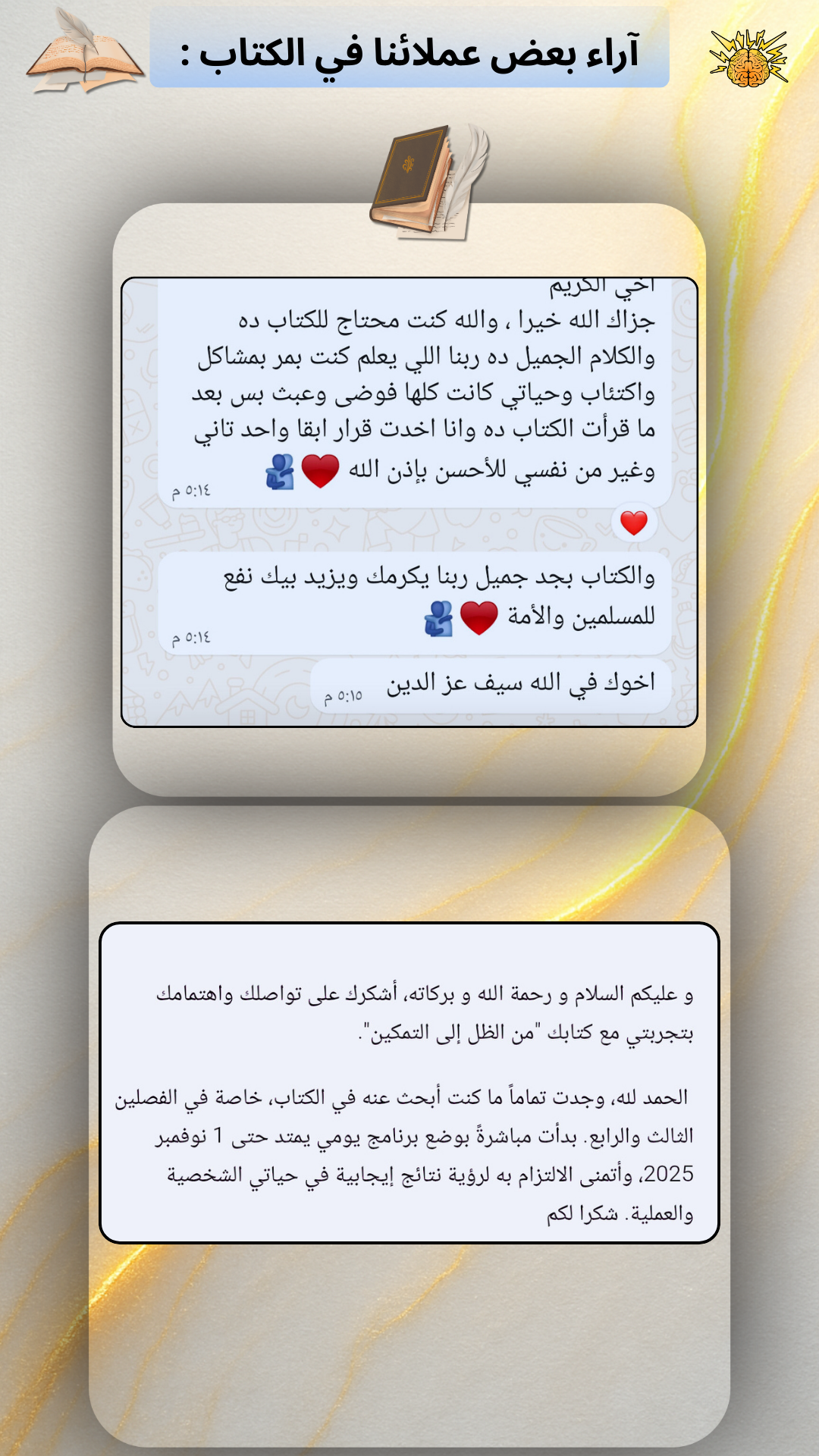 هذا الكتاب الأول "من الظل إلى التمكين" ليس حبرًا على ورق، وليس نصائح مكررة كما تراها في كل مكان